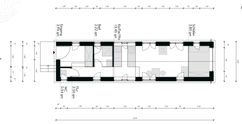 Hausmaße: 3 x 12 x 4 m (Breite x Länge x Höhe)